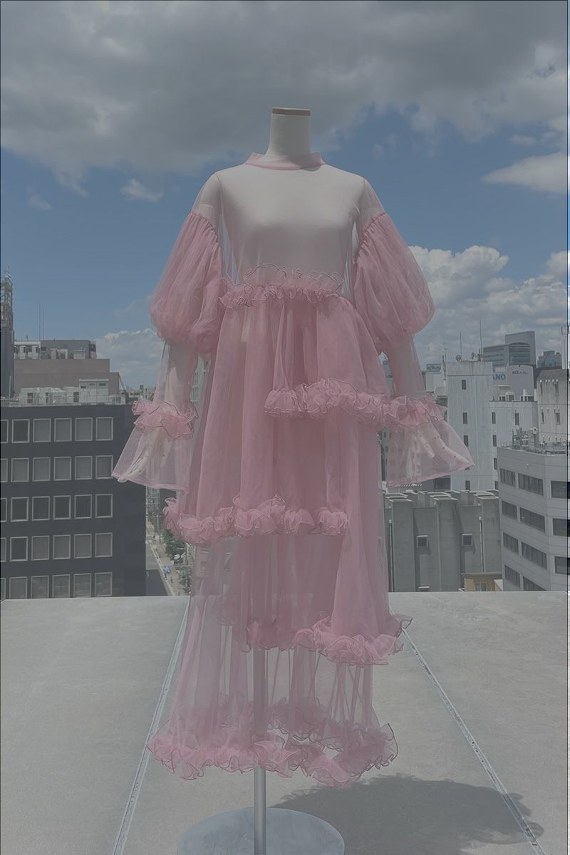 袖まわりと裾まわりにはハードなチュールを重ね形をつくり、 少しトーンの違う生地を合わせることでカラーコントロールしたグラデーションでより立体感を演出。