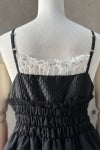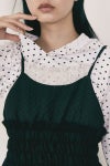胸元に添えられたラメ入りレースが静かに輝きを添え、上品でロマンティックなアクセントに。