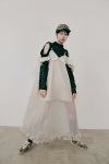 フェイクレザーは凛とした存在感を放ち、スカートのメッシュはベールのように幻想的な雰囲気を醸しだし、まるで白昼夢の中へと誘います。